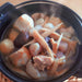 (2)温まったら中火か弱火にし、さといも、いもたきこんにゃく、干し揚げ、鶏もも肉、しいたけを入れます。