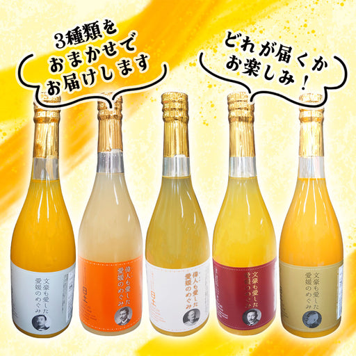 いしづち山麓マルシェネットではなかなか手に入らない、店頭限定の人気シリーズを3種セットでご用意 愛媛県産の柑橘を使用した、人気のジュース3種セットです。 「文豪も愛した」「偉人も愛した」と名付けられたシリーズから、当店が選んだ3種をお届けします。 どのジュースが届くかは開けてからのお楽しみ。ご家庭用にはもちろん...
